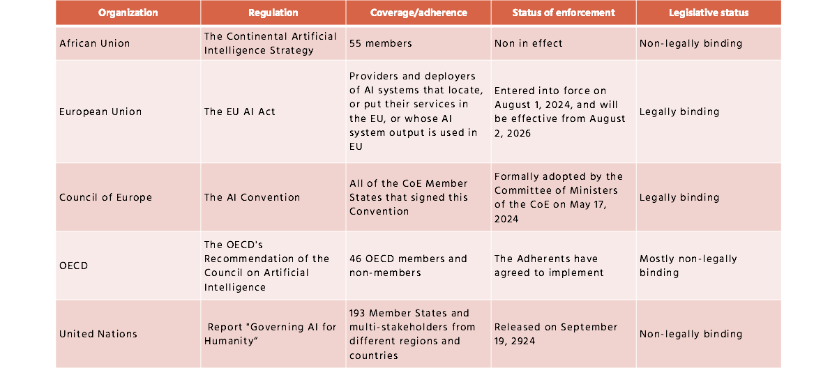 Five major international organizations have issued regulatory instruments addressing AI governance and ethics. Table 1 summarizes key characteristics of these regulations.