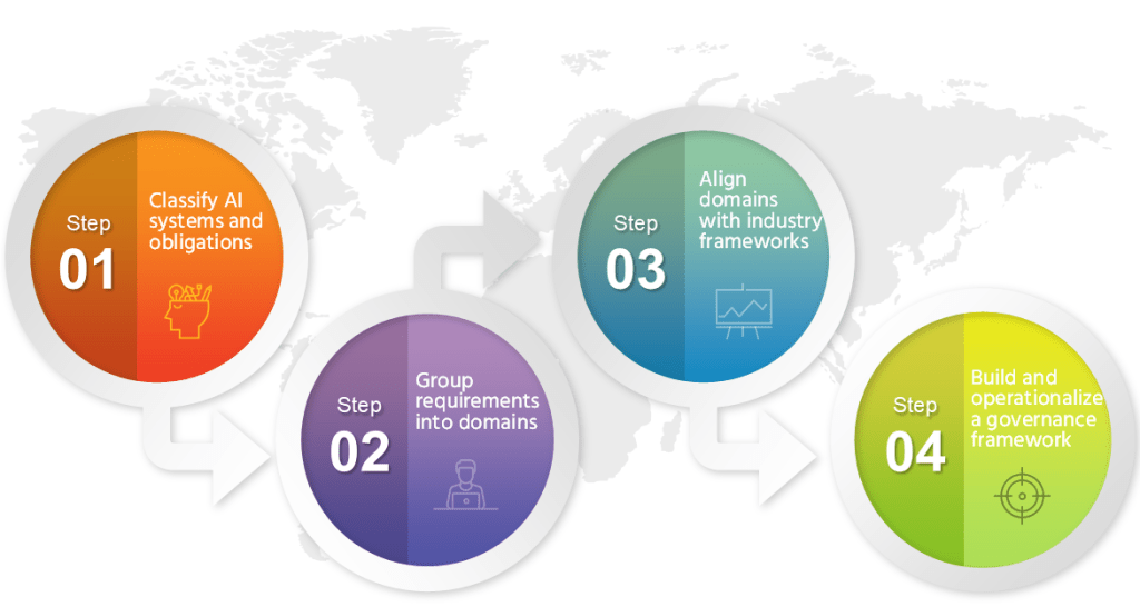 The process begins by classifying AI systems and identifying obligations. It continues by organizing regulatory requirements into logical domains. These domains can then be aligned with established industry frameworks. Finally, organizations can shape and operationalize an internal governance framework that transforms regulatory pressure into a structured, sustainable capability. Let’s start with Step 1.